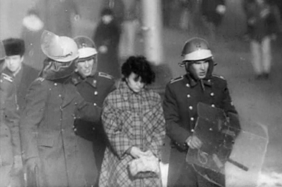— Адамдар өте көп екен. Орта тұсы көрінбейді. Құрбым екеуміз нөпірдің екпінімен арасына ығысып, кіріп кеттік. Көп өтпей бір-бірімізден ажырап қалдық. «Бірнәрсе айтып, сөйлеп жатқандар бар ма екен?» — деп алға жылжи беріп, дәл ортасынан бір-ақ шығыппын. Сол мезетте әскери адамдардың жүгіріп келе жатқанын көрдім. Елдің бәрі қашпақшы болып, бір-бірінің үстіне құлады. Мен де құладым. Екі қолымнан екі милиция ұстап, тұрғызды. Жүздеріне қарасам, өзіміздің қазақтың жігіттері. Бірақ жібермеді. Екі жағымнан мықтап ұстап алып, әлдебір жаққа қарай әкетіп барады. «Сүйремеңдер, өзім жүрем» деп біреуінің қолын қағып жібердім. Әлгі белгілі болған бейне көрініс дәл осы кезде түсірілген болуы керек.